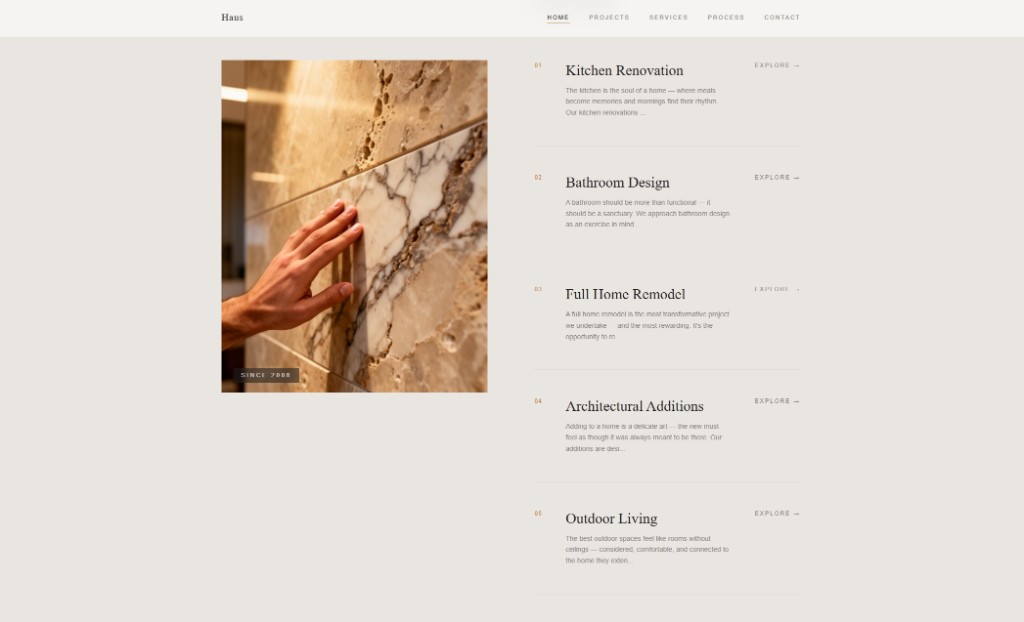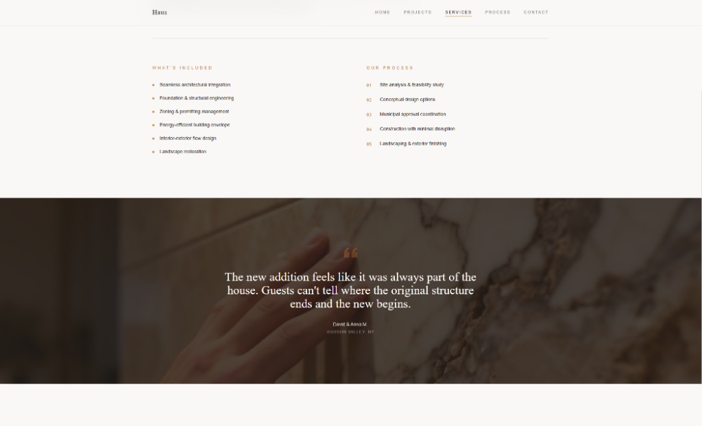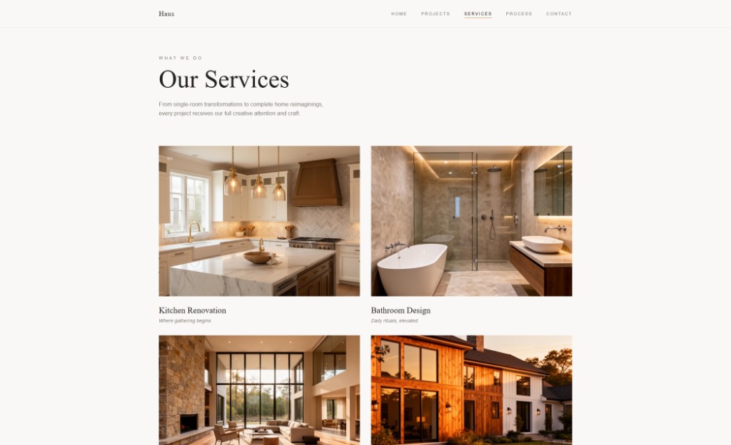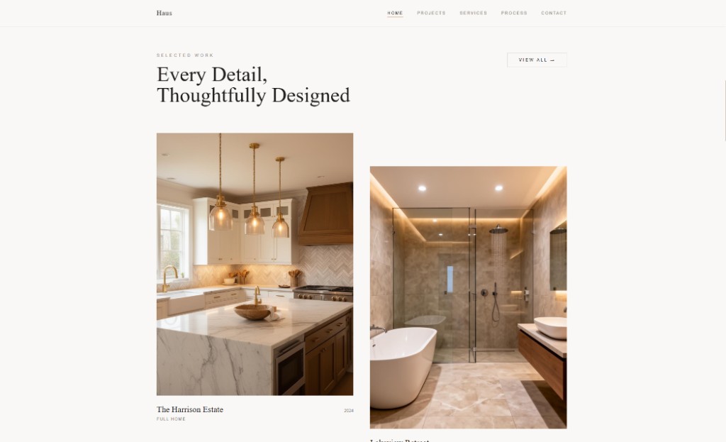 Premium renovation buyers judge studios on visual craft before they read a sentence. Haus needed a site that felt bespoke, handled large imagery and motion without jank, and communicated process and outcomes without diluting the luxury tone.