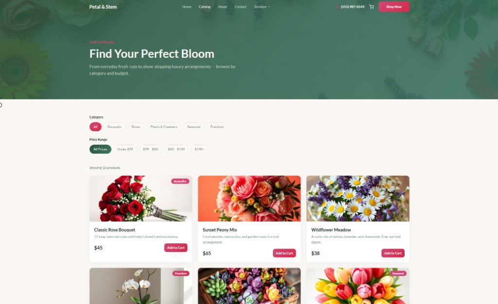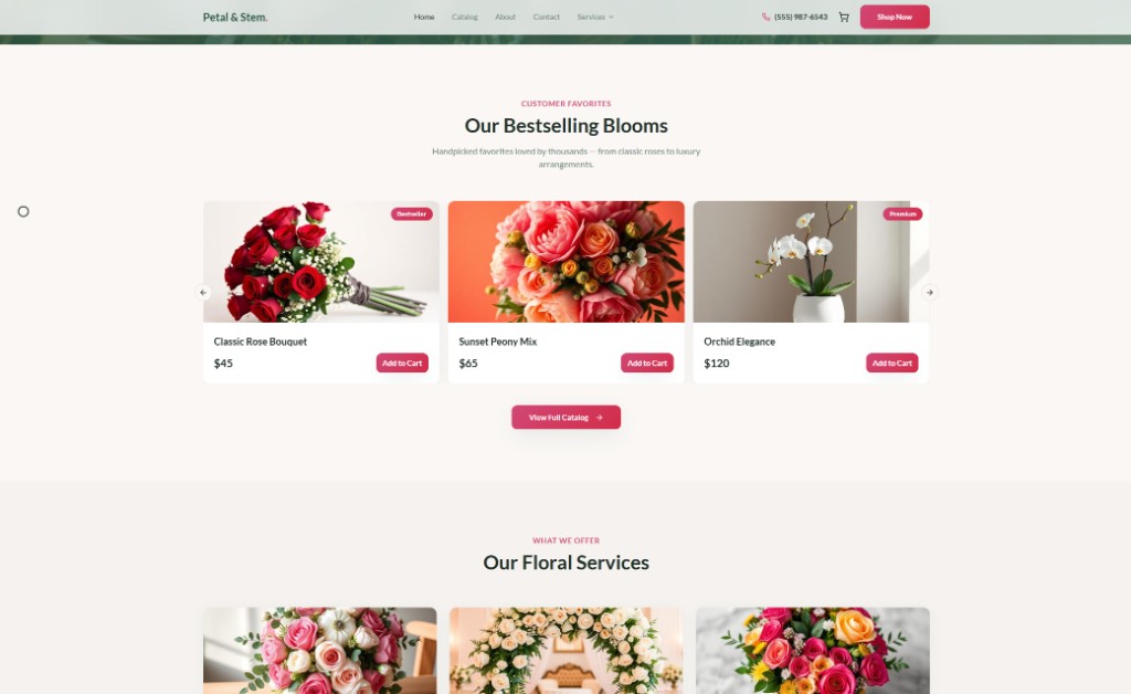 Petal & Stem is a florist and bouquet brand site blending romance and commerce. The hero introduces same-day delivery and handcrafted positioning; a bestseller-style carousel showcases arrangements with pricing; service tiles cover custom bouquets, weddings, and gifts; stats and testimonials reinforce freshness and volume; footer navigation mirrors catalog, services, about, and contact paths.