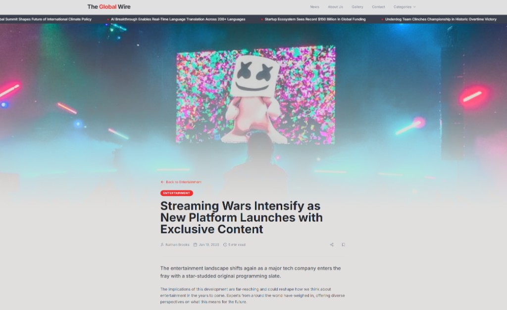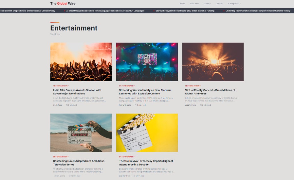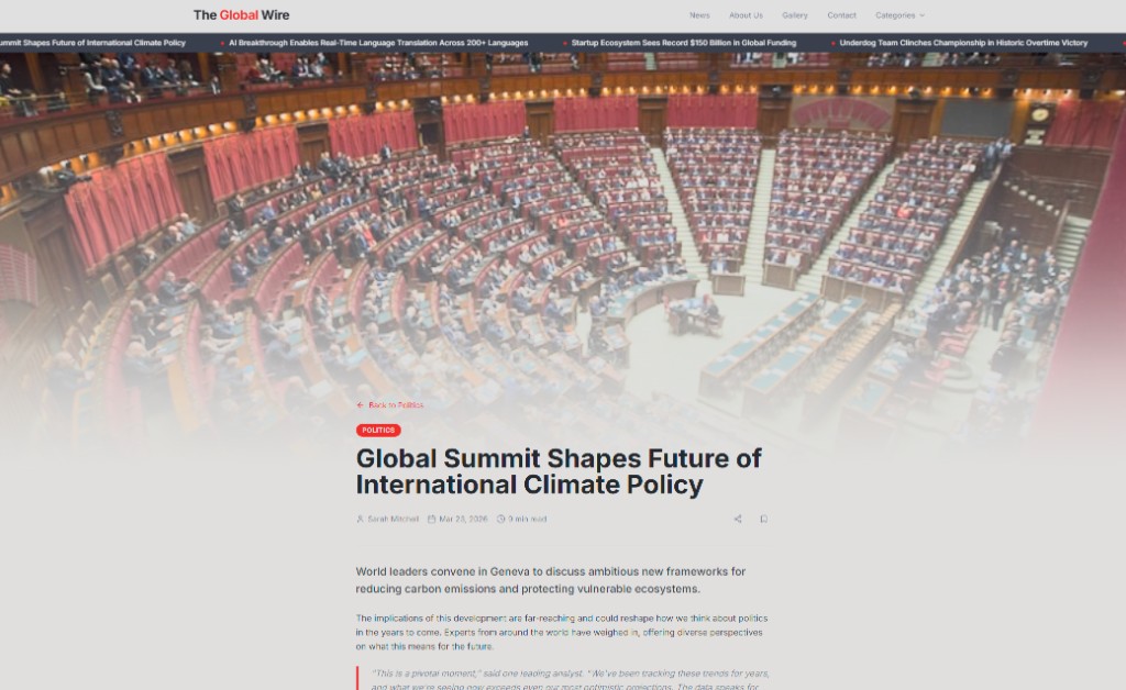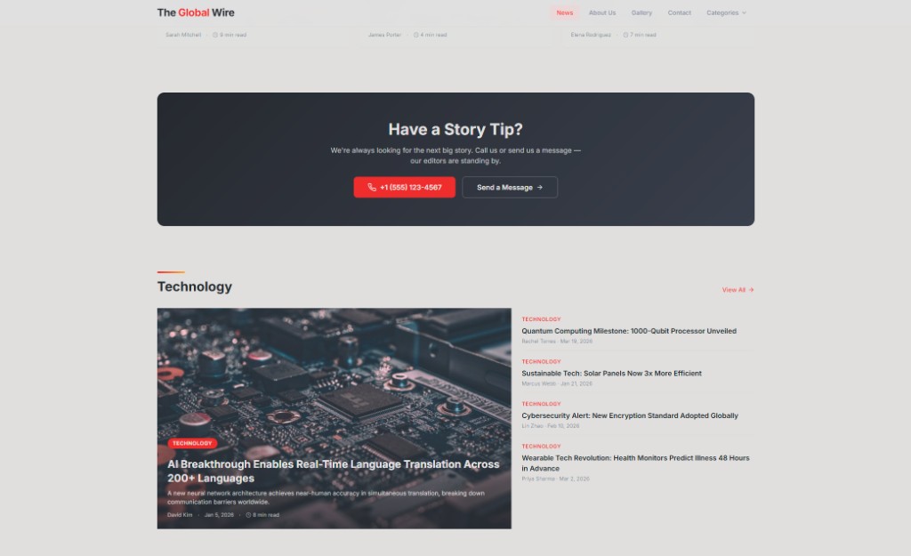 The Global Wire is a digital news destination with category navigation, a ticker-style headline rail, hero feature story, multi-column category hubs, trending sidebar, newsletter signup, advertising CTA, and rich footer navigation. Article cards mix imagery, category chips, read times, and author bylines to mimic major editorial networks.